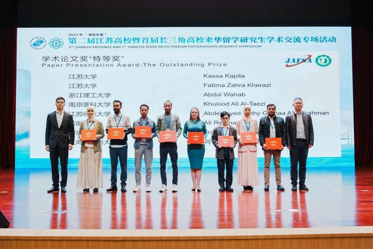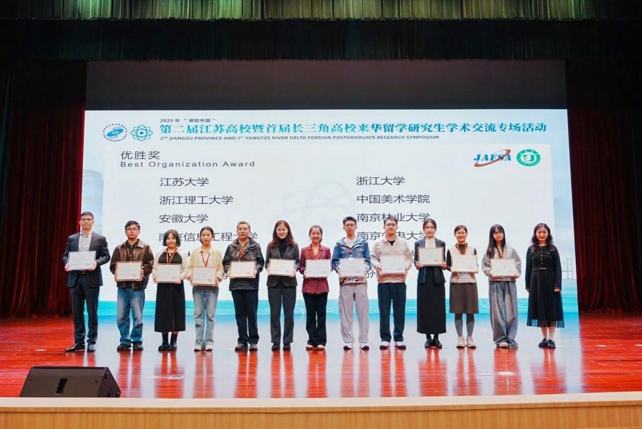 10月25日至26日,由国家留学基金管理委员会主办,江苏省高等教育学会外国留学生教育管理研究委员会、江苏大学承办的2025年“感知中国”第二届江苏高校暨首届长三角高校来华留学研究生学术交流专场活动在江苏镇江圆满落下帷幕。国家留学基金管理委员会来华管理部主任、中国高等教育学会外国留学生教育管理分会秘书长李彦光,江苏省教育厅二级巡视员焦伟,浙江省教育厅国际合作交流处一级调研员杜健,江苏省教育厅对外合作与交流处处长施蕴玉、四级调研员李勤径,江苏省高等教育学会外国留学生教育管理研究委员会副理事长兼秘书长张海军,浙江省国际学生教育教学指导委员会秘书长陈敏之,浙江省高等教育学会外国留学生管理分会秘书长俞文娴,安徽省外国留学生教育管理学会副秘书长樊永刚,副校长蔡英凤、相关职能部门领导出席开幕式。
