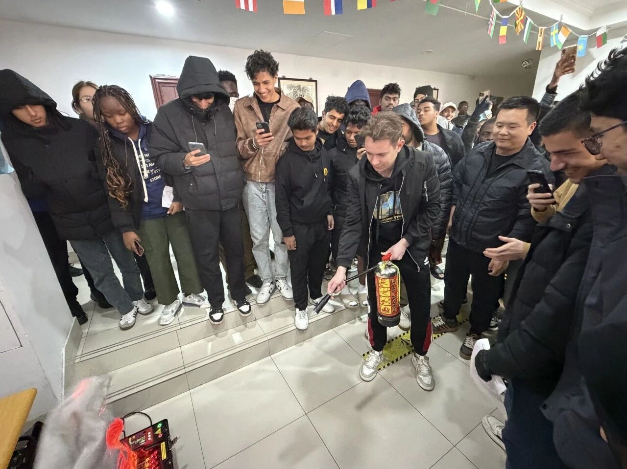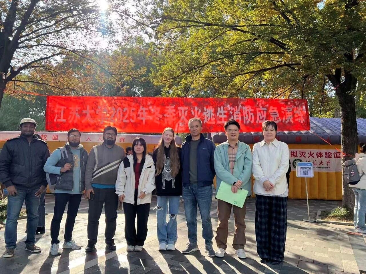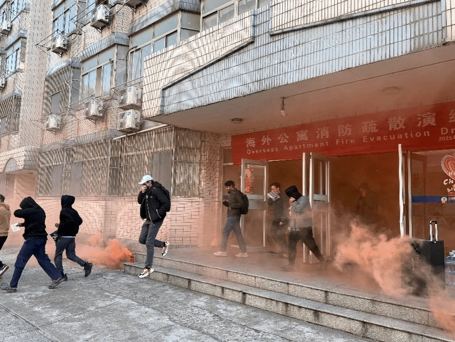 To further consolidate the effectiveness of fire safety education, OEC collaborated with JSU Security Department and Logistics Department, jointly held a fire emergency evacuation drill at the international student apartments on November 18. Class teachers detailed key knowledge including common causes and hazards of campus fires, alarm procedures, fire escape skills, and initial fire-fighting methods. During the drill, students covered their mouths and noses with towels, bent down to keep a low posture, and quickly and orderly evacuated to a safe area along designated routes. After assembly, a headcount was conducted to ensure all participants were safe. Following the drill, teachers and students also learned and practiced the standardized use of electronic fire extinguishers, further consolidating their fire-fighting skills.